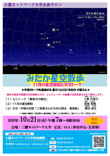 19時00分〜20時30分 | 三鷹ネットワーク大学 | 「星のソムリエみたか」の皆さん | みたか星空散歩―11月の星空解説と天文トーク [トピックと語り手] (1)ミニトーク「真夜中の星空」…上野 万里子 (2)11月の星空解説…妹尾 英樹 (3)天文・宇宙のお話「二等星さんたち自ら語る 復刻版」…梅村卓生 |