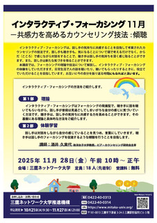 本講座では、フォーカシングの理論や技法について解説し、インタラクティブ・フォーカシングの体験をしていただきます。日常生活で人の話を聴いたり、聴いてもらったりするときに、役立てていただけることを目指しています。お互いに今の自分を振り返る時間にもなればと思います。