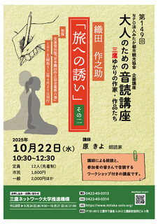 次回の「大人のための音読講座(ワークショップ付き朗読会)三鷹ゆかりの作家・作品たち」は、2025年11月26日(水)を予定しています。