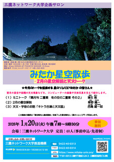 19時00分〜20時30分 | 三鷹ネットワーク大学 | 「星のソムリエみたか」の皆さん | みたか星空散歩―2月の星空解説と天文トーク [トピックと語り手] (1)ミニトーク「隔月刊二重星 冬の空の二重星 その2」…蒲生 敦 (2)2月の星空解説…草野 颯一 (3)天文・宇宙のお話「キトラ古墳と天文図」…西島 雄一郎 |