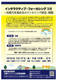 本講座では、フォーカシングの理論や技法について解説し、インタラクティブ・フォーカシングの体験をしていただきます。日常生活で人の話を聴いたり、聴いてもらったりするときに、役立てていただけることを目指しています。お互いに今の自分を振り返る時間にもなればと思います。