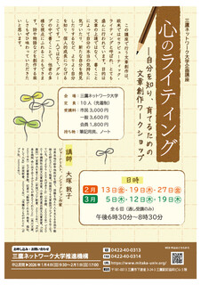 この講座で行う文章創作は、欧米ではセラピューティック・ライティングと呼ばれ、とても盛んに行われています。目的は文章の上達ではなく、書くことによって自分の本当の気持ちに気づいたり、新たな自分を発見したりするなど、よりよく自分を知り、個人的成長につなげることです。一人ではなく、グループの中で書くことで、他者の多様な視点にふれることもできます。詩や物語などを創作する楽しさもぜひ味わっていただきたいと思います。