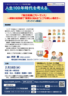 わが国は世界に例をみない急激な少子高齢化がすすんでおり、社会の在り方を抜本的に見直す時期にきています。人生100年時代の社会で、充実し安心して生活するためには、若いうちから学び、働き、人生設計を考えることが大切です。そのためには、国等に依存する(公助)だけでなく、地域での助け合い(共助)、自助努力(自助)が重要になっています。ビューティフルな人生を送るためには、自らを育てる“育自”が必要なのです。本講座では、シニア世代の方々へ「学び方」「働き方」「生き方」を考えていただく機会を提供していきます。