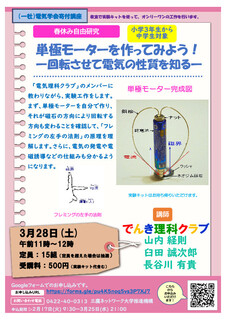 11時00分〜12時00分 | 三鷹ネットワーク大学 | 山内 経則、臼田 誠次郎、長谷川 有貴 | (一社)電気学会が派遣する「電気理科クラブ」のメンバーに教わりながら、実験工作をします。 まず、単極モーターを自分で作り、それが磁石の方向により回転する方向も変わることを確認して、「フレミングの左手の法則」の原理を理解します。 さらに、電気の発電や電磁誘導などの仕組みも分かるようになります。 |