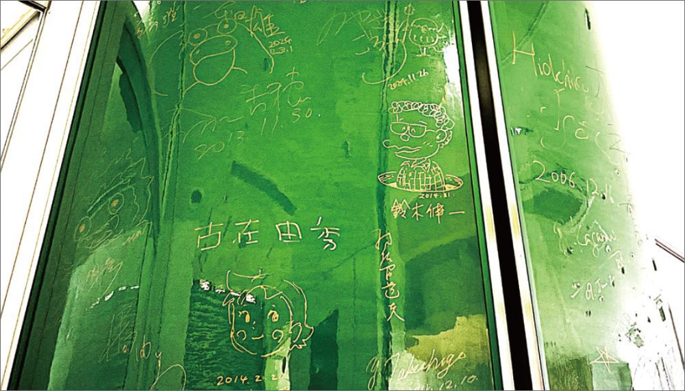 三鷹ネットワーク大学内の柱には、アニメーション文化講座の講師をはじめとする著名人のサインが記されています。