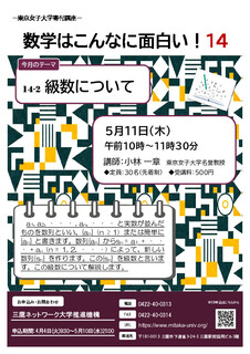 10時00分〜11時30分 | 三鷹ネットワーク大学 | 小林 一章 | 級数について a1, a2, , an, と実数が並んだものを数列といい、{an} (n 1) または簡単に{an} と書きます。数列{an} からsn = a1 + + an (n = 1, 2, ) によって、新しい数列{sn} を作ります。この{sn} を級数と言います。この級数について解説します。 |