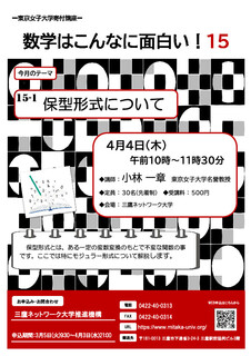 10時00分〜11時30分 | 三鷹ネットワーク大学 | 小林 一章 | 保型形式について 保型形式とは、ある一定の変数変換のもとで不変な関数の事です。ここでは特にモジュラー形式について解説します。 |