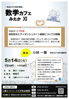 10時00分〜11時30分 | 三鷹ネットワーク大学 | 小林 一章 | 保型形式とアイゼンシュタイン級数についての問題 保型形式のΓ-同値に関する問題、モジュラー群についての問題、アイゼンシュタイン級数についての問題などについて皆さんと議論をしながら解いていきましょう。 |