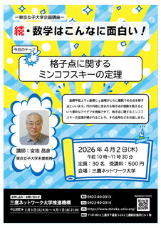 10時00分〜11時30分 | 三鷹ネットワーク大学 | 宮地 晶彦 | 座標平面上でx座標とy座標がともに整数である点を格子点といいます。円の内部に含まれる格子点の個数を数えるという素朴なアイデアを発展させて、格子点に関するミンコフスキーの定理が導かれることや、その応用などをお話します。 |
