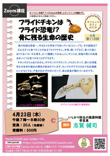 19時00分〜20時30分 | Zoomオンライン | 志賀 健司 | フライドチキンはフライド恐竜!? 骨に残る生命の歴史 鳥の先祖は恐竜―。今はもう小学生でも知っているくらい。でも、その証拠は? みんなきっと食べたことのあるフライドチキン。手羽、脚、リブなど、食べた後に出てくるいろいろな骨を、よ〜く観察してみましょう。そこには、恐竜の骨との共通点をいくつも見つけることができます。 チキンだけじゃありません。サケだってブタだって、イルカにだって、骨には何億年もの生命の進化の歴史が刻まれています。モンゴルやアラスカまで化石発掘にいかなくても、夕食のおかずの中にだって、実は恐竜が隠れているのです。 |