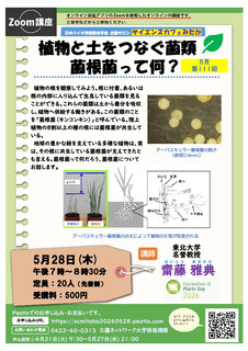 19時00分〜20時30分 | Zoomオンライン | 齋藤 雅典 | 植物と土をつなぐ菌類―菌根菌って何? 植物の根を観察してみよう。根に付着、あるいは根の内部に入り込んで生息している菌類を見ることができる。これらの菌類は土から養分を吸収し、植物へ供給する働きがある。この菌類のことを「菌根菌(キンコンキン)」と呼んでいる。陸上植物の8割以上の種の根には菌根菌が共生している。 生物の進化の歴史を振り返ると、植物が海の中から陸地へと上がってきた5億年ほど前から、植物の根には菌根菌が共生し、長い進化の歴史を一緒に過ごし、現在に至っている。 地球の豊かな緑を支えている多様な植物は、実は、その根に共生している菌根菌が支えてきたとも言える。菌根菌って何だろう、菌根菌についてお話します。 |