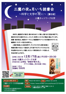 三鷹ネットワーク大学では、4月から月1回夜の読書会を開催しています(8月と3月除く)。本や読書に関心のある方を対象に、毎月1冊の本をめぐって楽しく語り合い、交流する場です。毎月のテーマ本をあらかじめお知らせして、国内外のSF小説を中心にコミック、科学エッセイなど幅広く読んでいます。