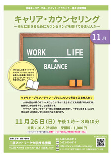 13時00分〜15時10分 | 三鷹ネットワーク大学 | カウンセラー | 【講座内容】 めまぐるしく変わる社会情勢、人々の意識、時代の流れ、大きな変化が続く中で、一人ひとりが「幸せに生きる」ことを実感するためには、自分らしさを内省することが重要です。 キャリア・カウンセラーと一緒に自分自身と向き合い、「幸せに生きる」ことを考えるきっかけにしていただければ幸いです。今後の働き方について、家庭と仕事の両立について、悩んで気分が落ち込んでいる方、気持ちがもやもやしていて整理したい方、どなたでもご参加頂けます。 【当日の流れ】 午後1時00分〜午後1時30分 講義 〔休憩〕 午後1時35分〜午後2時20分 個別カウンセリング/ワークシート作成 〔休憩〕 午後2時25分〜午後3時10分 個別カウンセリング/ワークシート作成 ※ 講義・個別カウンセリングは、NPO法人日本キャリア・マネージメント・カウンセラー協会会員の認定キャリア・カウンセラーで、キャリアコンサルタント(国家資格)を取得しているキャリア・カウンセラーが担当します。 |