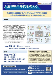 15時00分〜16時30分 | 三鷹ネットワーク大学 | 甲斐 幸一郎 | いま私たちは、平均寿命が延び「人生100年時代」と言われる社会を生きています。 この長い人生を 充実し、安心して生きるためのカギは、自分の強みを最大限に活かし、学び続け、主体的に人生を設計することです。 キャリア理論に基づいて、ご自身のキャリアを振り返り、そして人生を楽しむためのセカンドキャリアを一緒に考えていきたいと思います。 よりよい人生を実現するためには、自らを成長させ続ける“育自(いくじ)”の姿勢も欠かせません。今回の講演では、「学び方」「働き方」「生き方」をテーマに、一人ひとりがビューティフルな人生を歩むためのヒントを共有いたします。 どうか皆さまご自身の強みを再確認し、あなただけのキャリアプランを描き、これからの人生を楽しんでいただきたいと願っています。 |