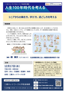 15時00分〜16時30分 | 三鷹ネットワーク大学 | 楯 兼次 | 今日、人生100年時代といわれています。平均寿命は、毎年少しずつ延びており、それに伴って、いわゆる健康寿命が長くなっています。長寿化に対応して、長くなる人生を元気に有意義に送ることが、自分自身にとってはもちろん、家族、社会にとっても、とても重要になっています。中・高年齢者の活躍が今後の社会の持続的発展に欠かせません。 シニアの働き方、学び方、時間の過ごし方はそれぞれです。その人なりに充実した人生が送れるとよいですね。 67歳で会社を退職。それまでの経験を活かして社会保険労務士事務所を開業し、現在多くの企業のお手伝いをしています。また、72才から思い立って大学院に入学し、学びました。さらに仲間と一緒に毎年、東京の舞台で朗読の発表会を行っています。 社会保険労務士として独立して仕事をし、その仕事と顧客、企業での働き方との違いなどで思うこと、大学院で学び、その後の学び方などについて考え実践していること、朗読の仲間との活動で見つけた生きがいなどをご紹介しながら、自分らしく働き、学び、過ごすことをみなさんとともに考えたいと思います。 |