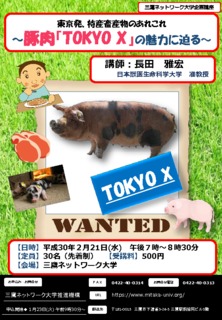 今回は東京で生産されていても、あまり知られていない畜産物を中心に紹介します。都会の中で静かなブームとなっている、東京だけにしかないという豚肉「TOKYO X 」。美味しさと安心・安全にこだわって生産される期待の星、魅力の逸品です。また、現在注目されているブラウンスイス種の乳製品・牛肉など、研究成果と併せてこれからの特産物はどうあるべきかを皆様と議論したいと思います。
