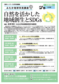 19時00分〜20時30分 | 三鷹ネットワーク大学、オンライン | 岩浅 有記 | トキの野生復帰について グリーンインフラ政策の具体事例としてトキの野生復帰、環境×農業について取り上げます。 |