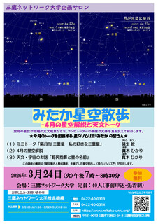 19時00分〜20時30分 | 三鷹ネットワーク大学 | 「星のソムリエみたか」の皆さん | みたか星空散歩―4月の星空解説と天文トーク [トピックと語り手] (1)ミニトーク「隔月刊 二重星 私の好きな二重星」…蒲生 敦 (2)4月の星空解説…真木 ひかり (3)天文・宇宙のお話「野尻抱影と星の名前」…真木 ひかり |