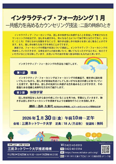 10時00分〜12時00分 | 三鷹ネットワーク大学 | 酒井 久実代 | インタラクティブ・フォーカシング1月―共感力を高めるカウンセリング技法:二重の共感のとき インタラクティブ・フォーカシングの方法をご紹介します。 第1部 理論 インタラクティブ・フォーカシングの背景、そのもとにあるフォーカシングの理論について紹介します。ワークの進め方について説明します。 第2部 体験学習 フォーカシングでは、話し手も聴き手も“感じること”を大切にします。感じていることに注意を向けて、それを言葉にしていく練習を行い、傾聴の体験を深めていきます。また、話し手は自分自身に、聴き手は話し手の感じていることに共感する“二重の共感のとき”を体験してみましょう。 |
