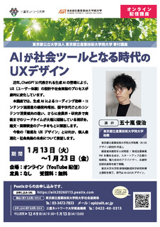 15時00分〜00時00分 | オンライン(YouTube) | 五十嵐 俊治 | AIが社会ツールとなる時代のUXデザイン 近年、ChatGPTに代表される生成AIの登場により、UX(ユーザー体験)の設計や社会実装のプロセスが劇的に変化しています。 本講座では、生成AIによるコーディング効率・コンテンツ流通量の爆発的増加、国や世代ごとのコンテンツ消費傾向の違い、さらに産業界・研究界で実装までのリードタイムが大幅に短縮している現状を、論文・国際調査のデータをもとに解説します。 今後の「最適なUXデザイン」とは何か、個人最適化・社会実装の未来について展望します。 |