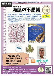 19時00分〜20時30分 | オンライン(Zoom) | 田中 次郎 | 海藻(かいそう)の不思議 海藻(かいそう)とは海に生育する緑藻(りょくそう)、紅(こう)藻(そう)、褐(かっ)藻(そう)のことです。緑藻は陸上の植物へと進化を遂げてきました。寒天等の材料になるテングサが属する紅藻類は太古より10億年間海でひっそりと生育し、ワカメが属する褐藻類はこの1億年で海洋沿岸生態系の主役になりつつあります。そんな海で生きるテングサとワカメの秘密に迫ります。 テングサの秘密: 紅藻って何だろう?海苔(のり)は紅藻?なぜ水深の深い場所に生育できるんだろう?世代交代はやたら複雑! 寒天って何だろう?増粘剤カラギーナンとの違いは?テングサ類の変わり者は? ワカメの秘密: 褐藻はなぜ大きくなれたの?褐藻はなぜ茶色?でも湯に入れるとなぜ緑になるの?めかぶ(ワカメの耳)って何だろう?ワカメはなぜ春にしかないの?ワカメやコンブの仲間は他にどんなのがあるの?ジャイアントケルプはコンブの仲間?ホンダワラはコンブの仲間? |