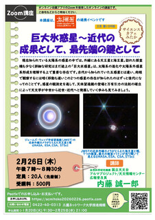 19時00分〜20時30分 | Zoomオンライン | 内藤 誠一郎 | 巨大氷惑星〜近代の成果として、 最先端の鍵として 現在知られている太陽系の惑星の中では、外縁にある天王星と海王星。訪れた探査機も少なく詳細な研究はまだ途上の「巨大氷惑星」は、太陽系の進化や太陽系外惑星系形成を理解する上で重要な存在です。 古代から知られていた五惑星とは違い、肉眼で観察するには暗く移動も遅いこの2つの惑星の存在が知られたのはずっと後代になってのことです。惑星の観測史を通して、天体望遠鏡の登場と万有引力の法則の確立によって天文学が中世から近世・近代へと発展していく歩みも見てみましょう。 ※本講座は三鷹科学の森文化祭「みたか太陽系ウォーク」の連携イベントです。 |