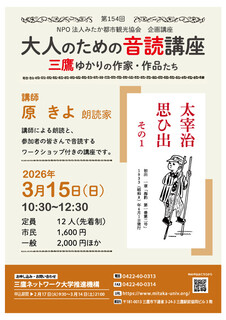 次回の「大人のための音読講座(ワークショップ付き朗読会)三鷹ゆかりの作家・作品たち」は、2026年4月25日(土)を予定しています。